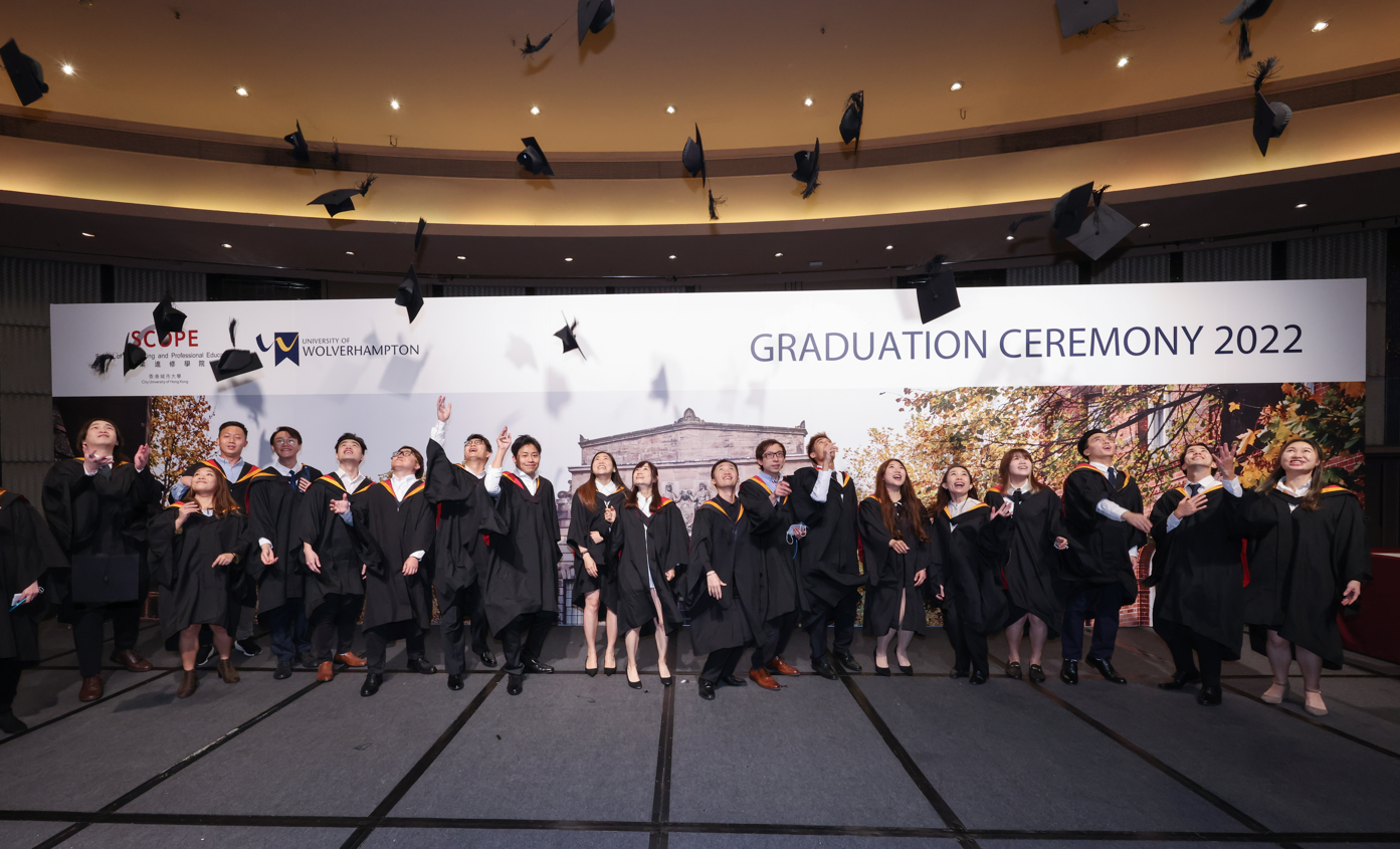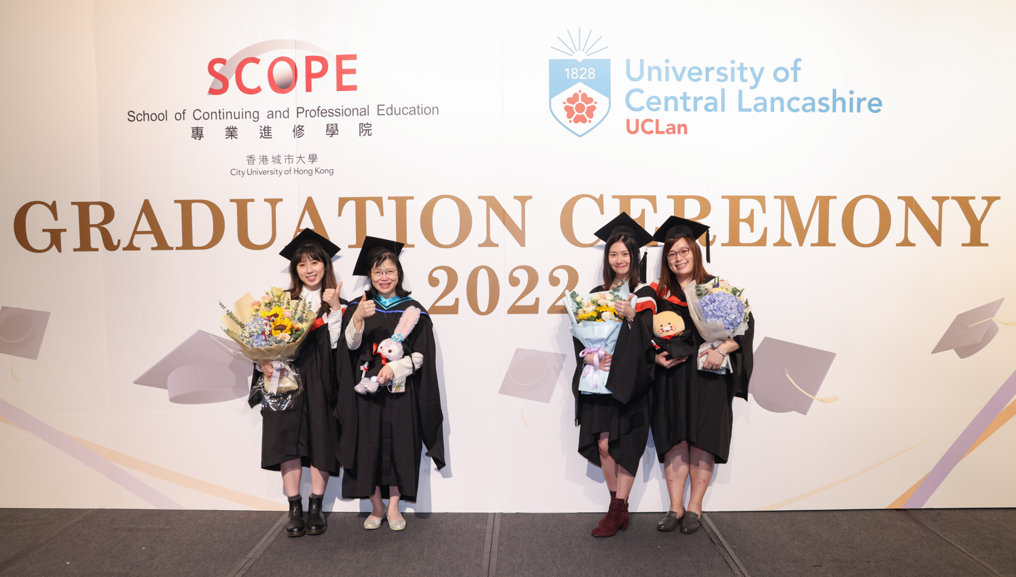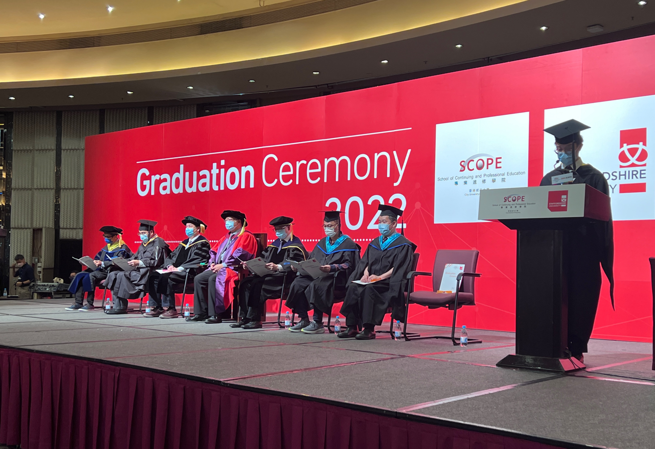 To proudly celebrate the conferment of honours degree and master degree awards for 2022 graduates from Coventry University, De Monfort University, Staffordshire University, Sheffield Hallam University, University of Central Lancashire and University of Wolverhampton, a large- scale Graduation Ceremonies 2022 was held at the Kowloonbay International Trade & Exhibition Centre from 29th November to 1st December 2022 by the School of Continuing and Professional Education of City University of Hong Kong (CityU SCOPE). The 3-day long event was a great success, with a total attendance of over 1,000 participants, including, overseas representatives from UK university collaborators, SCOPE faculty members and administrative staff; and mostly importantly, some 800 undergraduate and postgraduate graduates and their families and loved ones.